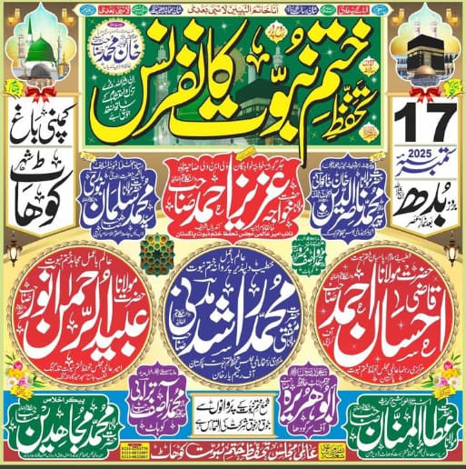 عقیدہ ختم نبوت کے تحفظ کے عظیم مقصد کے تحت ایک شاندار اور ایمان افروز اجتماع منعقد کیا جا رہا ہے، جہاں ملک کے نامور علماء کرام اپنے دلوں کو گرما دینے والے بیانات کے ذریعے ایمان کی شمعیں روشن کریں گے۔ یہ عظیم الشان کانفرنس نہ صرف عقیدے کی مضبوطی کا پیغام دے گی بلکہ اہل ایمان کے لیے تاریخ ساز موقع فراہم کرے گی